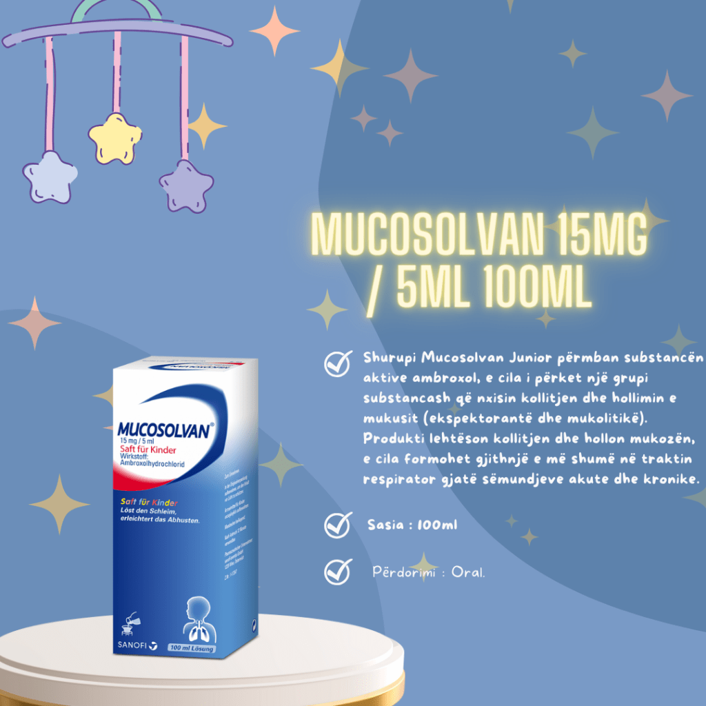 Shurupi Mucosolvan Junior përmban substancën aktive ambroxol, e cila i përket një grupi substancash që nxisin kollitjen dhe hollimin e mukusit (ekspektorantë dhe mukolitikë). Produkti lehtëson kollitjen dhe hollon mukozën, e cila formohet gjithnjë e më shumë në traktin respirator gjatë sëmundjeve akute dhe kronike.