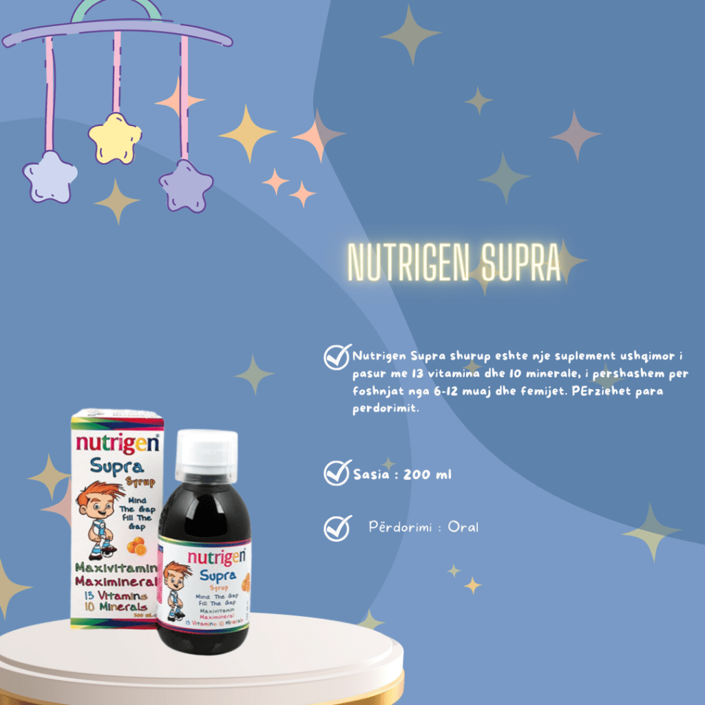Nutrigen Supra shurup eshte nje suplement ushqimor i pasur me 13 vitamina dhe 10 minerale, i pershashem per foshnjat nga 6-12 muaj dhe femijet. Perziehet para perdorimit. .